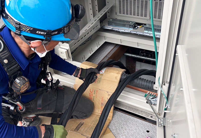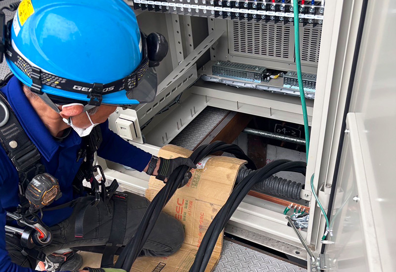 モーター、制御盤、変圧器、照明などを現場に設置する作業。中には重機を使って設置することもあります。